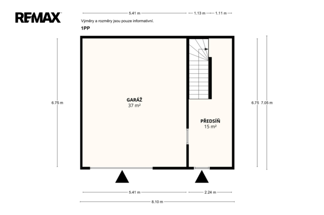 1. Nadzemní podlaží (52 m²): garáž pro dva vozy (37 m²), vstupní hala se schodištěm (15 m²)
