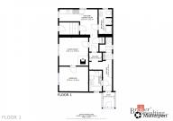 V přízemí se nachází vstupní chodba, dvě koupelny se sprchovým koutem a WC, kuchyň s jídelním koutem, obývací pokoj a ložnice. Ve 2. nadzemním podlaží je menší chodba, další ložnice, kuchyň a obývací pokoj. Dům je částečně podsklepený.