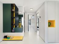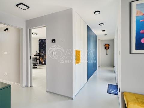 Použity jsou prémiové designové tapety Glamora – ruční italská výroba patřící ke světové špičce, nabízejí vysokou odolnost, jedinečný vzhled a nadčasovou eleganci. Nábytek na míru od firmy HANÁK, bezfalcové dveře a KARE desing. Celkový koncept interiéru je moderní, čistý a harmonický.