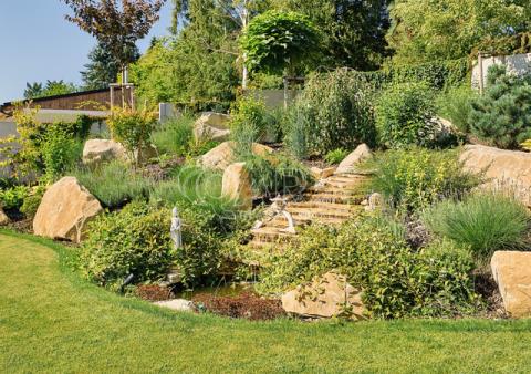 Zahrada je koncipována jako přirozené pokračování domu a její součástí je: