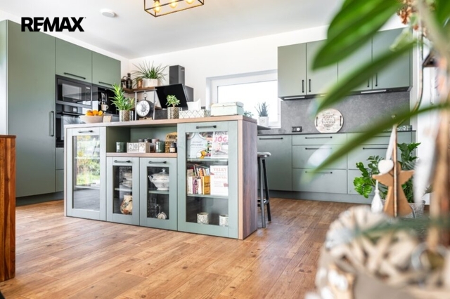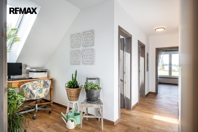 Interiér domu je kompletně hotový, velmi vkusně zařízený včetně moderní kuchyně a je laděn do harmonického celku, každý detail je součástí promyšlené koncepce příjemného bydlení.