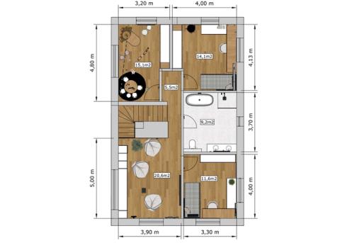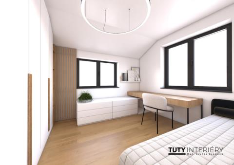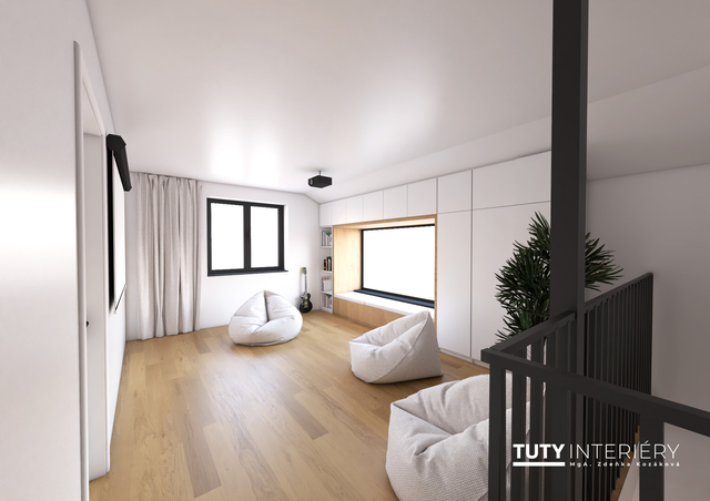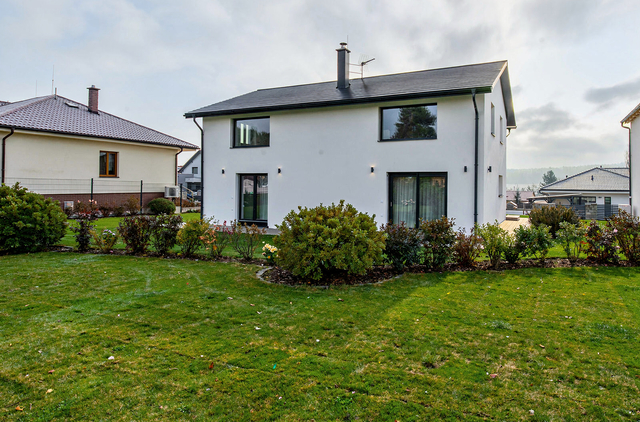 V 1.patře jsou 3 pokoje, velkorysá koupelna a především velký odpočinkový prostor u schodiště s krásným, proskleným výhledem na zahradu. Celý dům má naddimenzovány elektro rozvody (zásuvky, vypínače), připraveno je připojení na optický kabel. Vytápění domu pomocí tepelného čerpadla DAIKIN. V celém domě je realizováno podlahové vytápění.