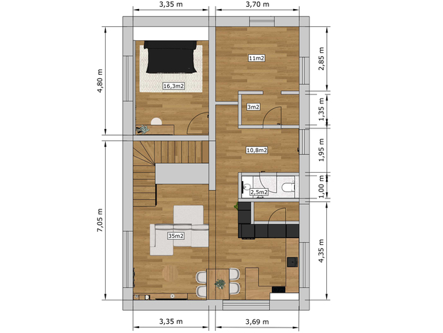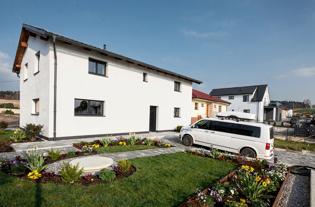 Celá novostavba je řešena pro náročnější klientelu, má k dispozici min. 2 parkovací místa, 3 vstupy do domu (hlavní vstup, boční vstup z tech.místnosti, zadní vstup na terasu se zahradou), dále venkovní el. stahovací rolety a především velmi propracovanou dispozici obou podlaží. V přízemí domu se nachází prostor kuchyně do tvaru L spolu obývacím pokojem s krbem a schodištěm do 1.patra, ložnice/pokoj a dále je na podlaží umístěna technická místnost, koupelna se sprch.koutem, toaleta.