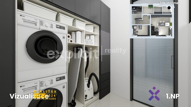 - každý dům má samostatné technické zázemí (pro pračku i sušičku), plynový kotel, rekuperaci i retenční nádrž