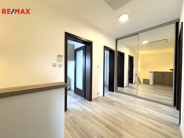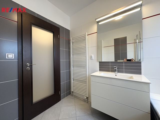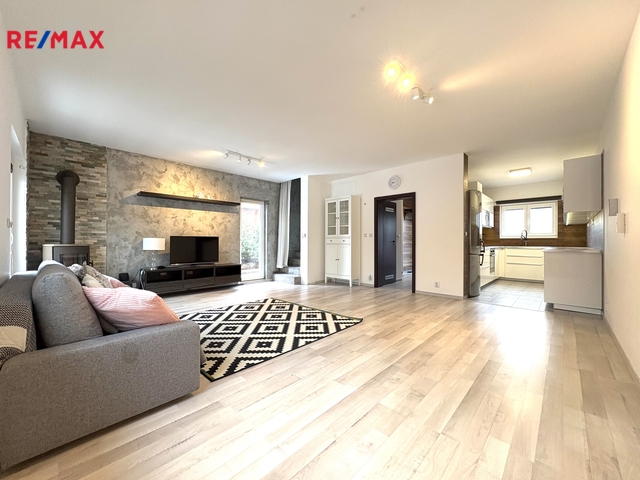 Exkluzivní nabídka prodeje velice pěkného slunného krajního dvoupodlažního rodinného domu v řadové výstavbě (trojdům) s dispozicí 4+kk (užitná plocha 102 m2), se 2 koupelnami, uzavíratelnou pergolou, 2 parkovacími stáními a udržovanou zahradou (311 m2) se zahradním domkem, který je situovaný do zástavby rodinných domů v atraktivní a klidné lokalitě obce Klecany s velmi dobrou dostupností do Prahy (metro Kobylisy cca 10 min. autem nebo PID autobusem). Díky promyšlené koncepci je dům příjemně prostorný a komfortní. Dispoziční uspořádání domu: V přízemí se nachází prostorná předsíň s vestavěnou skříní, ve které je umístěný plynový kotel s boilerem, pračka a sušička, dále velký obývací pokoj s kuchyňským koutem (moderní designová kuchyňská linka s vestavěnými spotřebiči – indukční varná deska, elektrická trouba, mikrovlnná trouba, myčka nádobí, lednice s mrazákem, digestoř) a vstupem na terasu s uzavíratelnou pergolou a zahradu, toaleta s umyvadlem a komora. V 1. patře se nachází 3 samostatné pokoje, centrální chodba s vestavěnou skříní a velká koupelna s vanou, umyvadlem a toaletou. Podkroví tvoří prostorná otevřená galerie a jeden samostatný pokoj. Velké podkroví (půda) o velikosti 66 m2 je možné upravit na další obytný prostor. Podlahy jsou tvořeny kombinací plovoucí podlahy (pokoje, chodba v 1. patře), příjemné moderní dlažby (koupelny, kuchyně) a koberce (schodiště). Vytápění domu zajišťuje vlastní plynový kotle (s podlahovým vytápěním Protherm) a je doplněno krbovými kamny v obývacím pokoji. Ohřev hody zajišťuje velký boiler. Dům je zabezpečen alarmem. Voda i kanalizace jsou napojeny na obecní řád. V místě je kompletní občanská vybavenost (škola, školka, obchody, lékař, restaurace, ….). Součástí ceny je nabídka bezplatného zprostředkování financování a právní servis. Pro bližší informace či prohlídku kontaktujte makléře nabídky.