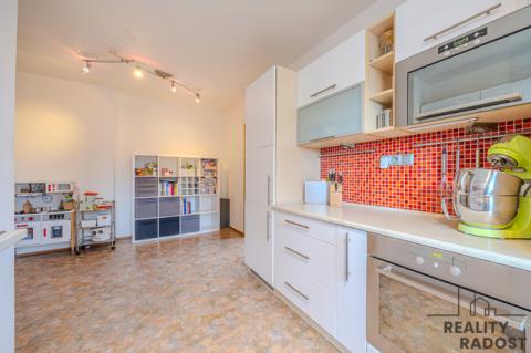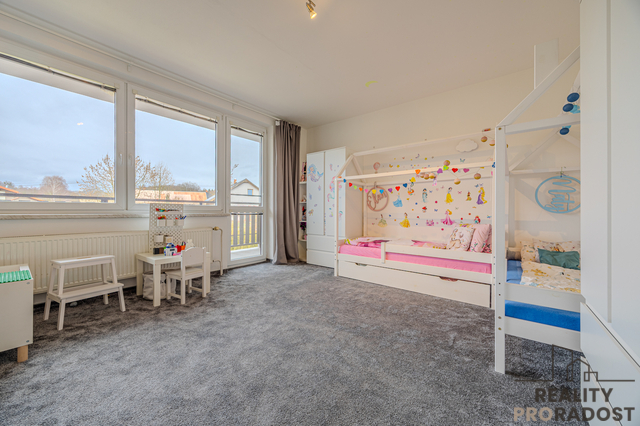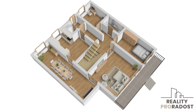 Srdcem domu je obývací pokoj propojený s terasou a zahradou – místo pro letní večery, oslavy i rodinnou pohodu. Obývací pokoj navazuje na jídelnu a ta na moderní kuchyni s indukční varnou deskou, troubou, myčkou a dalším vybavením. V přízemí nechybí ani pracovna a pokoj, který lze využít jako hernu nebo pokoj pro hosty. Koupelna se nachází mezi dvěma pokoji, je zde i komora. Celý prostor působí útulně a propojeně.