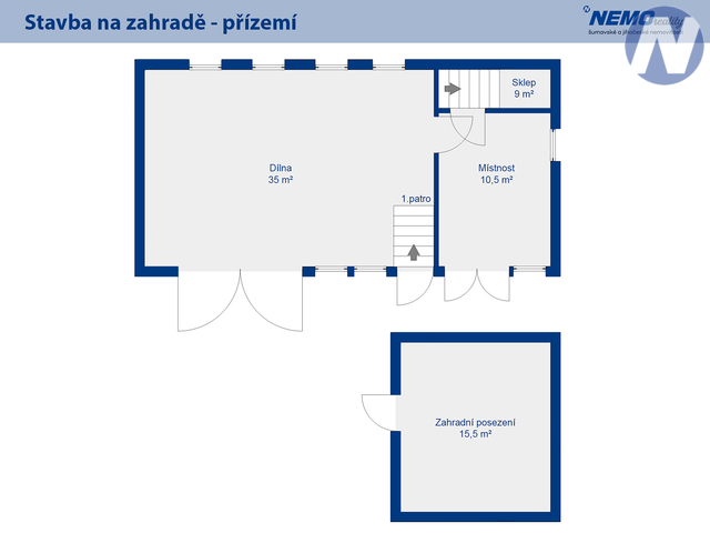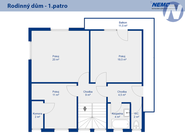 V druhém nadzemním podlaží se nacházejí 2 větší a jeden malý pokoj, vhodný jako pracovna. Je zde i koupelna a samostatné WC.