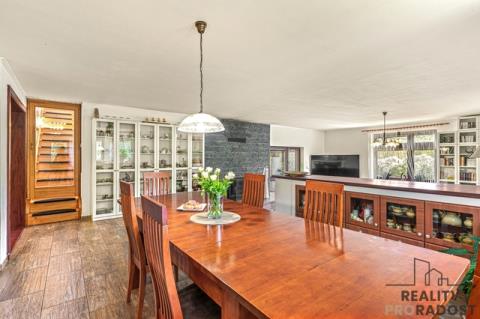 Dům o dispozici 6+1 je po částečné rekonstrukci (dokončené obytné podkroví 2020) a ve výborně udržovaném stavu. Interiér domu je pečlivě navržený tak, aby maximálně využil přirozené světlo. V přízemí se nachází prostorný obývací pokoj, který je propojen s kuchyňským koutem a zimní zahradou. Tato otevřená dispozice vybízí k rodinnému posezení a pohodlnému trávení času s přáteli. Dalšími pokoji v přízemí jsou dvě ložnice, koupelna a oddělené WC, což zvyšuje komfort bydlení. V podkroví je samostatná obytná jednotka se světlou ložnicí, koupelnou a kuchyňským koutem, která je ideální pro hosty, dospívající děti či pracovní prostory.