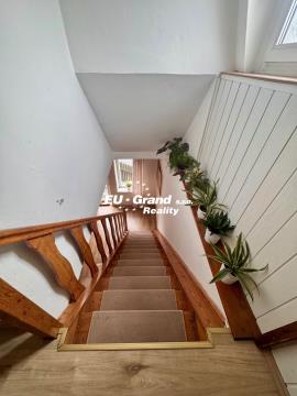 V patře je koupelna s WC, ložnice se vstupem na balkon, dva dětské pokoje, šatna a pracovna.