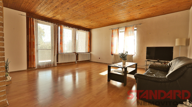 V 1. NP se nachází byt 4+1 s koupelnou a samostatnou toaletou. Z velkorysého obývacího pokoje s krbem a velkými okny je vstup na terasu orientovanou do zahrady. Kuchyně je vybavena prostornou linkou a plynovým sporákem s elektrickou troubou, dále jsou zde 2 dětské pokoje a ložnice. Podlahy: v obývacím pokoji plovoucí podlaha, v kuchyni, chodbě, koupelně a na toaletě dlažba, v ostatních pokojích lamino nebo koberec. Ze zádveří vedou schody do suterénu.