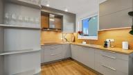 V přízemí se nachází velkorysý obývací prostor s kuchyňským koutem a vstupem na terasu (HS portál), dále pracovna a koupelna se sprchovým koutem a toaletou.