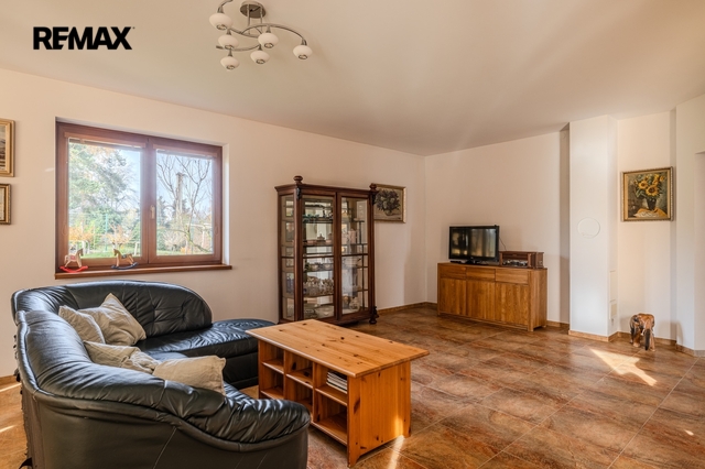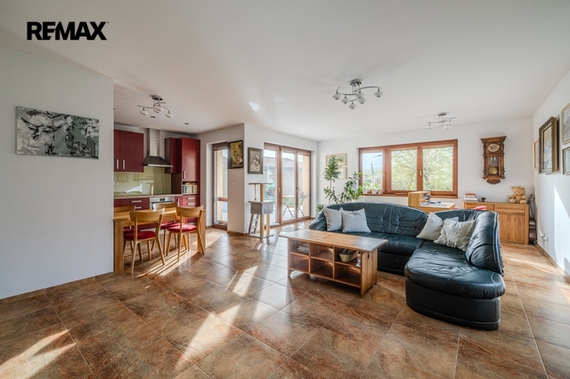 Světlý a útulný prostor s francouzským oknem přímo na žulovou terasu a k vyhřívanému bazénu.