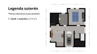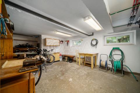 o Suterén: Zahrnuje garáž s vraty na dálkové ovládání, místnost s pingpongovým stolem, toaletu, velkou dílnu s domácí vodárnou a původně prádelnu s umyvadlem používanou na uložení zahradního nářadí.