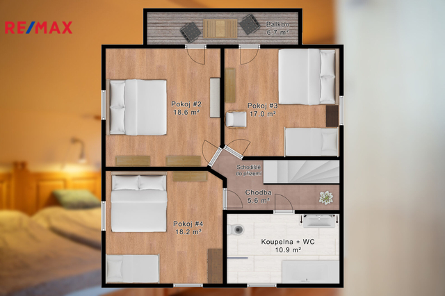 1. patro: tři ložnice (dvě s přístupem na balkon s výhledem na Lipno), koupelna s vanou a WC.