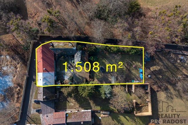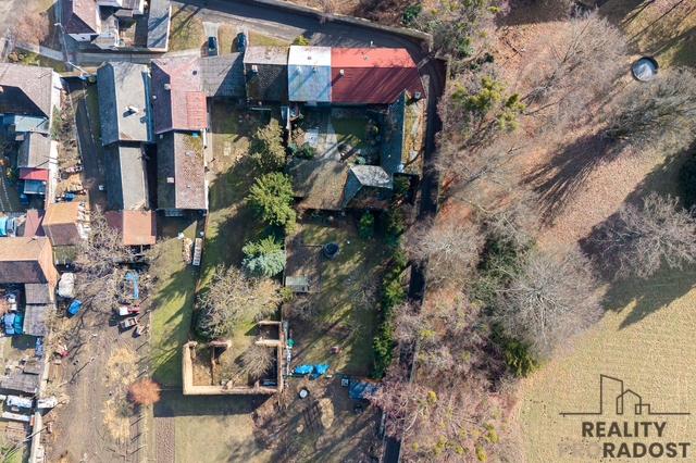 Součástí domu je slunný, uzavřený dvůr s posezením, zahradním jezírkem a okrasnou zahradou. Na dvůr navazuje menší stodola s průchodem do prostorné zahrady. Zahrada je oplocená, je zde skleník a vzrostlé stromy. Na dvoře jsou dvě garáže, udírna, kůlna a technické místnosti s dostatečným úložným prostorem. Na pozemku je vlastní studna a velká retenční nádrž, která zajišťuje dostatek užitkové vody.