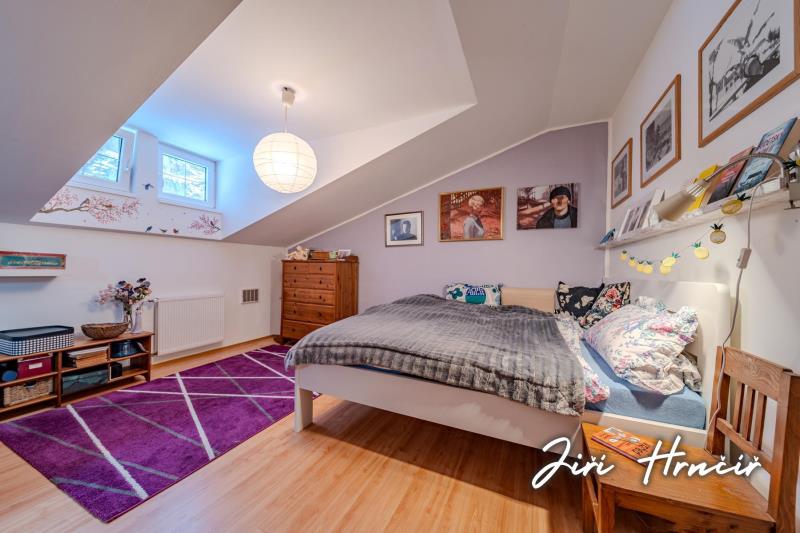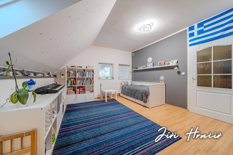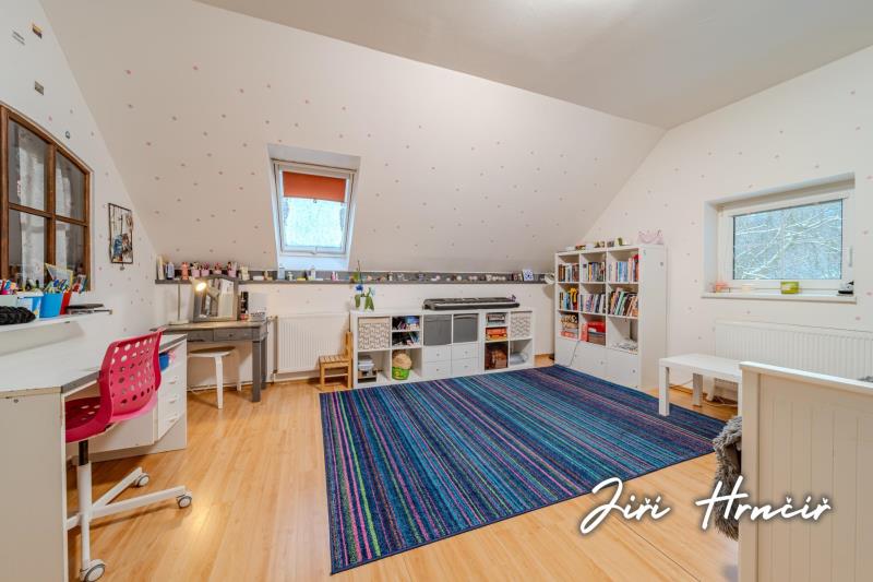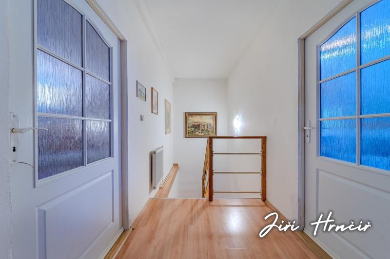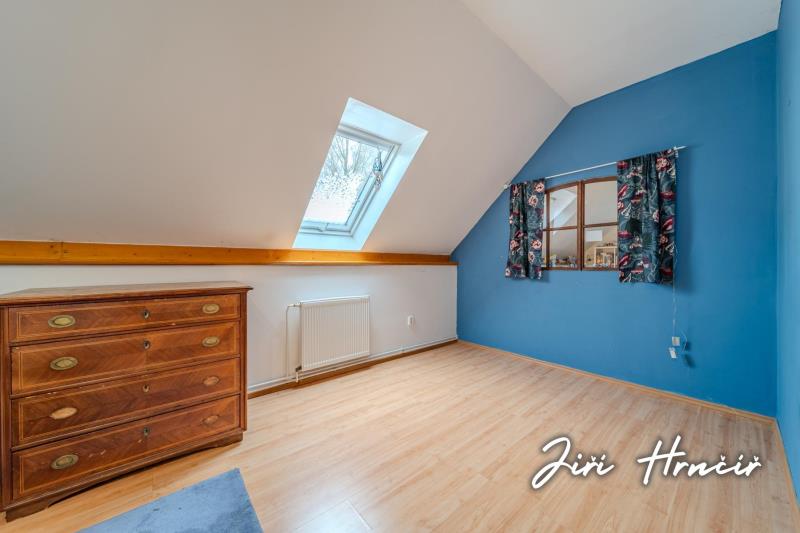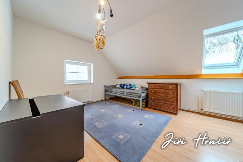 Druhé nadzemní podlaží je přístupné po dřevěném schodišti a tvoří jej centrální chodba se vstupy do dvou ložnic, dvou dalších pokojů, prostorné šatny s vestavěnými skříněmi a samostatného WC. Součástí je rovněž přístup na půdu, která poskytuje další úložný prostor. Dům je částečně podsklepen se vstupem do sklepa z exteriéru.