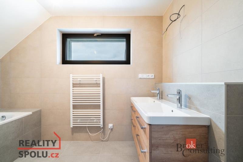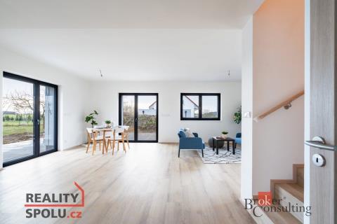 Jedná se o zděnou stavbu (Ytong) se dvěma nadzemními podlažími. Tato novostavba o dispozici 5+kk se nachází na pozemku o rozloze 665 m2, přičemž celková plocha domu činí 164,8 m2. V přízemí se nachází prostorný obývací pokoj spojený s kuchyní (41,1 m2) a vstupem na terasu (40 m2), dále je zde místnost, která může sloužit jako pokoj pro hosty či pracovna (11,8 m2), koupelna se záchodem (4,6 m2), technická místnost (2,9 m2) a ještě jedna menší místnost pod schody (4,0 m2). V prvním patře jsou dva pokoje s vlastní šatnou (17,8 m2 a 16,0 m2), dále ložnice (16,0 m2) se samostatnou šatnou (3,0 m2) přes chodbu a také druhá koupelna (6,1 m2). Jistě také oceníte pudní prostor o velikosti cca 40 m2.