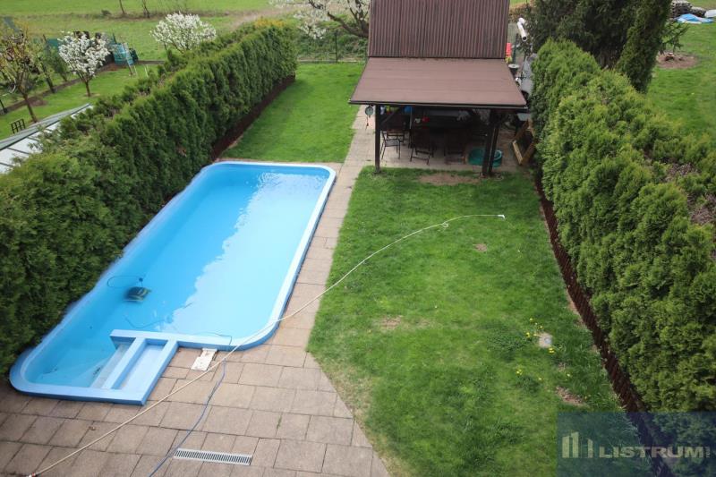 Na zahradě instalován zapuštěný bazén s technologií umístěnou ve sklepě domu, zahradní domek s místem pro uskladnění a krytým posezením a vyhřívaná vířivka pro 5 osob.