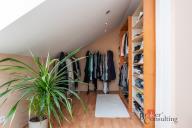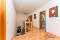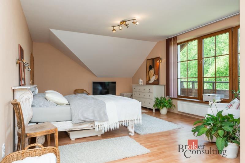 V 1. patře se dále nachází ložnice s šatnou (26,68 m² + 14,53 m²) a výhledem do zelené krajiny. Součástí 1. patra je dále chodba (11,68 m²), pokoj (24,56 m²), koupelna s toaletou (13,62 m²) a dětský pokoj (19,01 m²). Nad obytnou částí se nachází půdní prostor.