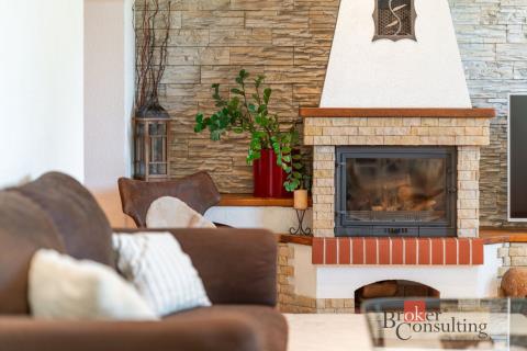 Dům obklopuje vzrostlá zeleň, která poskytuje vysokou míru soukromí. Součástí zahrady je útulná terasa s posezením a grilem, přístřešek pro parkování dvou aut a jezírko s molem.