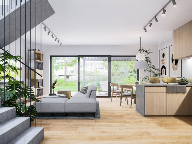 Užitná plocha domu činí přibližně 134 m² a rozložení prostoru je navrženo s ohledem na pohodlí celé rodiny. V přízemí se nachází prostorný obývací pokoj s velkými okny a přímým vstupem na terasu, na kterou plynule navazuje zahrada. Součástí obytné části je také kuchyňský kout, ideálně umístěný pro propojení s jídelnou i terasou, dále technická místnost, koupelna s WC a praktická pracovna. V horním patře jsou tři ložnice, šatna a hlavní koupelna.