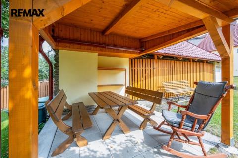 Dvě vedlejší stavby: dílna a dřevník včetně terasy s krytým posezením.