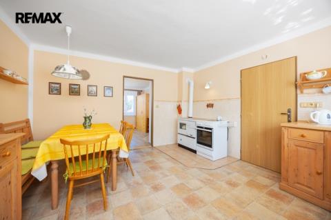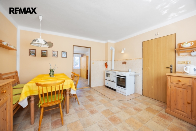 Kuchyni s jídelnou (15,5 m²) s kamny na dřevo a elektrickým sporákem.