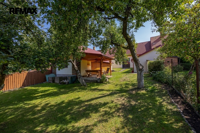 Udržovanou zahradu s ovocnými keři a stromy, ideální k relaxaci i pěstování květin či zeleniny.