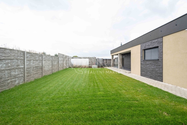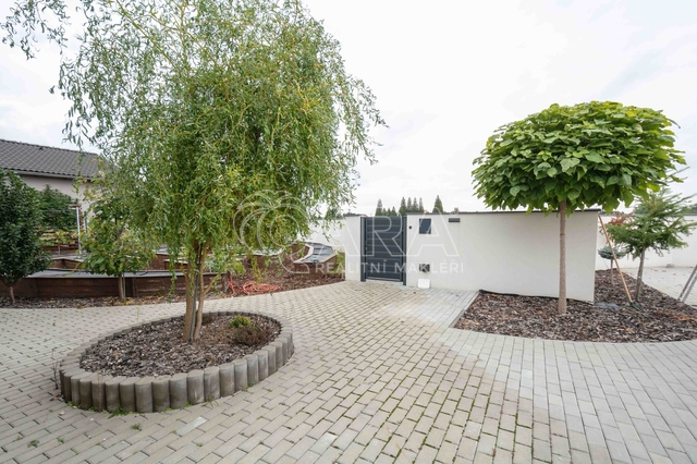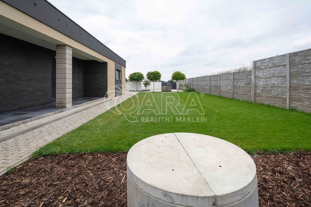 • Zahrada – travní koberce, centrální závlaha, vyvýšené záhony, rozvod studniční vody do každého záhonu, jímky na dešťovku (2 m3), příprava pro el. ovládání vrat, přístřešek na dřevo.