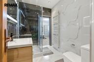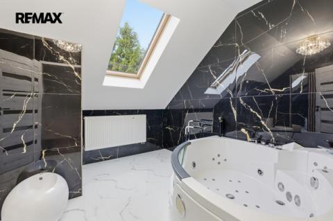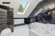 V patře je chodba (15,64 m²), koupelna s vířivou vanou, WC a bidetem (9,88 m²), ložnice (21,06 m²), pokoj (10,62 m²) a galerie (33,25 m²). Schodiště je obloženo pravým mramorem, koupelny mají stejně jako přízemí velkoformátové dlažby.