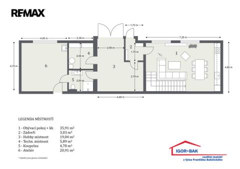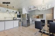 V přízemí hlavní části 4+kk se nachází prostorná kuchyně s jídelnou (35,91 m²), zádveří (3,03 m²), technická místnost (5,89 m²), hobby místnost (19,04 m²), koupelna (4,78 m²) a ateliér (20,91 m²). Kuchyně i přilehlé prostory jsou provedené v moderním stylu s velkoformátovou mramorovou dlažbou 1,5 × 3 m.