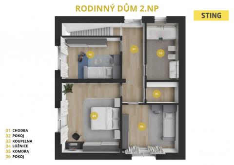 2. NP je více v obytném stylu, protože jej tvoří tři pokoje. Všechny pokoje jsou v tomto domě neprůchozí, což přispívá k soukromí a lepší využitelnosti prostoru. V tomto patře se navíc můžete těšit na krásnou moderní koupelnu a praktickou komoru.