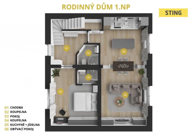 V 1. NP naleznete rozměrný obývací pokoj, ve kterém bude kuchyňská linka, kterou si zvolíte přímo na míru. Jsou zde připraveny rozvody vody, odpadu i elektřiny. Na tomto patře ještě naleznete samostatný pokoj s vlastní toaletou a koupelnu.
