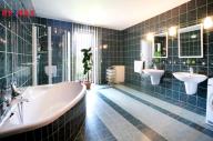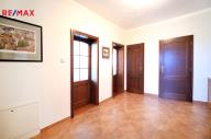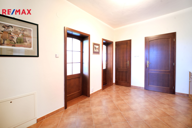 Do domu vstupujeme přes zádveří do vstupní haly, z níž vcházíme jak do pracovny, komory, WC a na schodiště do garáže, tak i do hlavní denní části domu. Tou je prostorný obývací pokoj s krbem, útulnou kuchyní na míru, včetně kvalitních spotřebičů, a navazující vzdušná zimní zahrada. Z ní se po schodech dostaneme do 2. NP, kde se nachází ložnice, luxusní koupelna se samostatnou toaletou, šatna a další pokoj. V suterénu domu se dále nachází garáž, kotelna, sklad a schodiště do přízemí. Vjezd do dvojgaráže je zabezpečen dálkově ovládanými vraty.