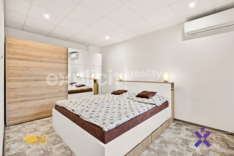 Ve 2. nadzemním podlaží se nachází dva samostatné pokoje využitelné jako ložnice a dětský pokoj či pracovna. Oba pokoje poskytují dostatek soukromí a variability využití. V ložnici je instalována klimatizace, která zvyšuje komfort zejména během horkých letních dnů. Z chodby je vstup na prostornou 20 m² velkou terasu, která představuje další příjemný venkovní prostor vhodný pro relaxaci, ranní kávu nebo večerní posezení.