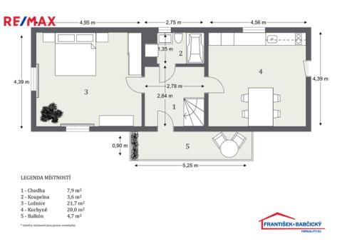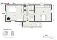 Stávající dvoupodlažní dům má dispozici vycházející z půdorysů: v přízemí se nachází předsíň, komora, obývací pokoj s kuchyňským koutem, další pokoj, toaleta, garáž, prostorná prádelna a další úložné prostory. V patře je umístěna chodba, koupelna, ložnice, kuchyně a balkón s výhledem do zahrady. Celková plocha dle plánů činí 177 m², včetně garáže, balkónu i vedlejších hospodářských částí. Na pozemku se nachází také samostatná garáž a technické zázemí, které mohou sloužit jako dílna nebo sklad.
