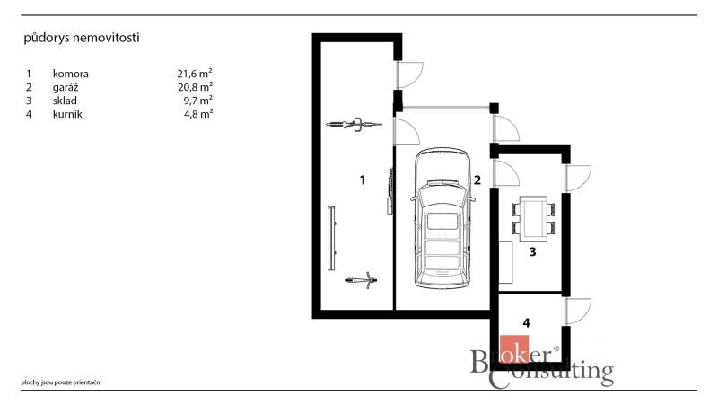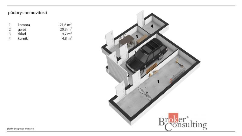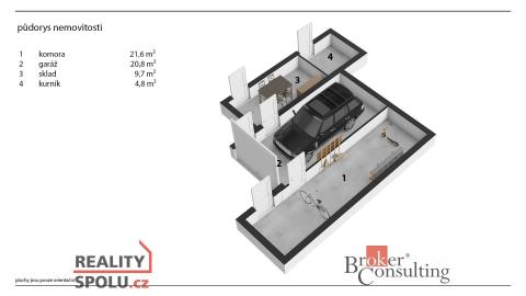 Součástí domu je také garáž o výměře 20,8 m², sklad 9,7 m² a další komora 21,6 m², které poskytují dostatek úložných prostor.