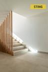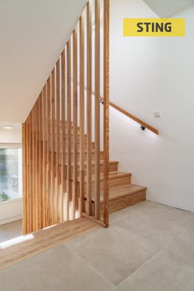 Schodiště: Luxusní jasanové schodiště s lamelovými dekorativními prvky dodává interiéru moderní a stylový vzhled.