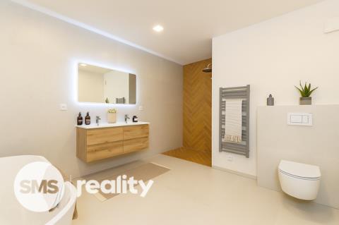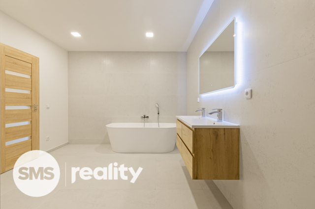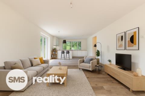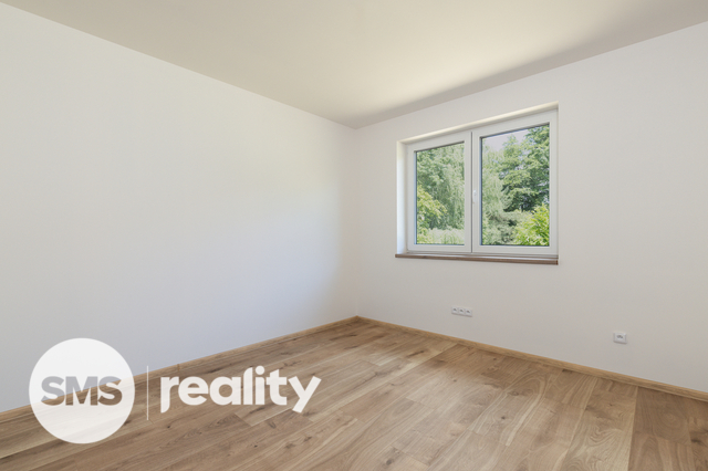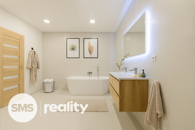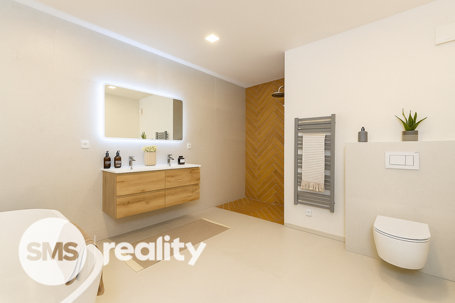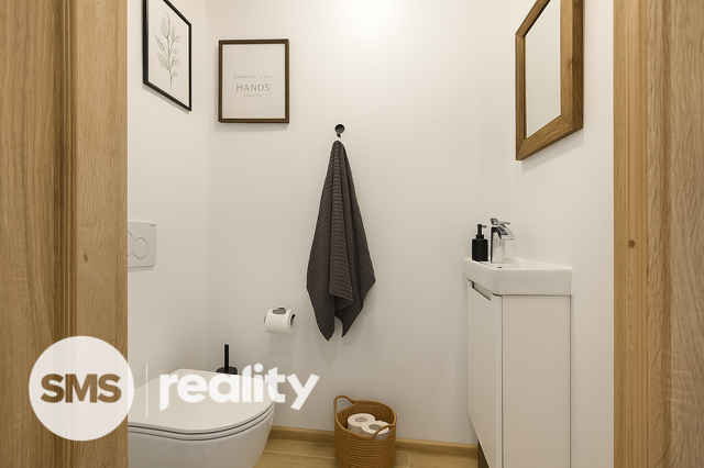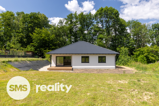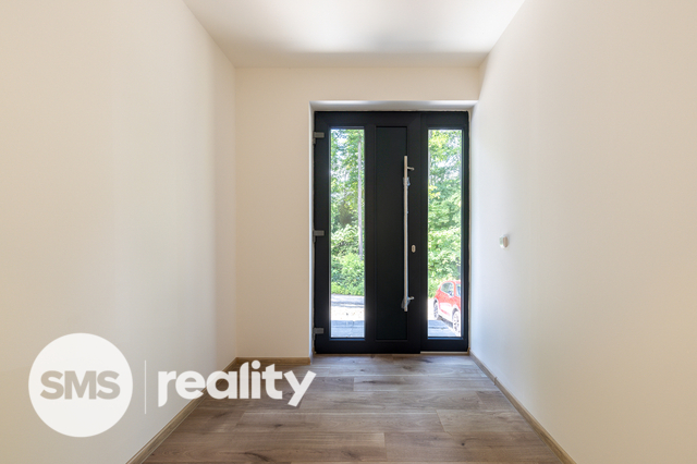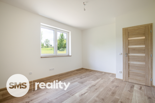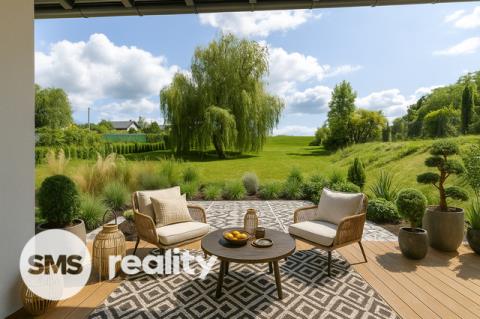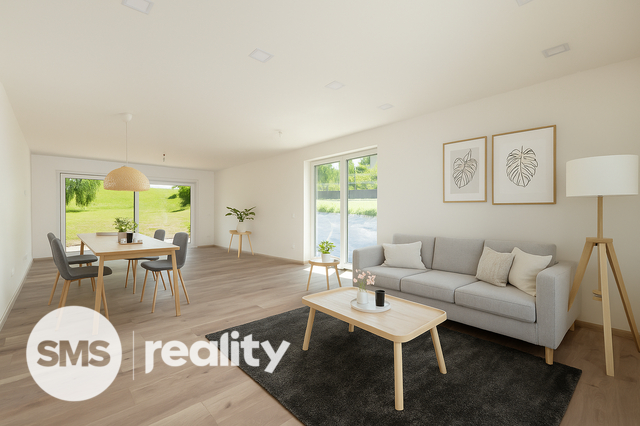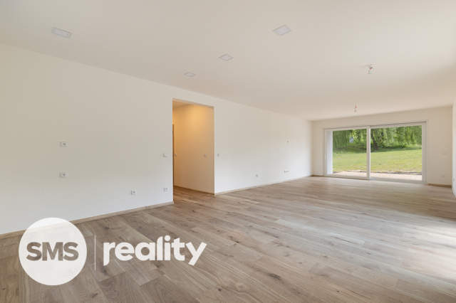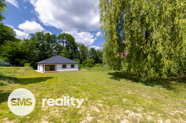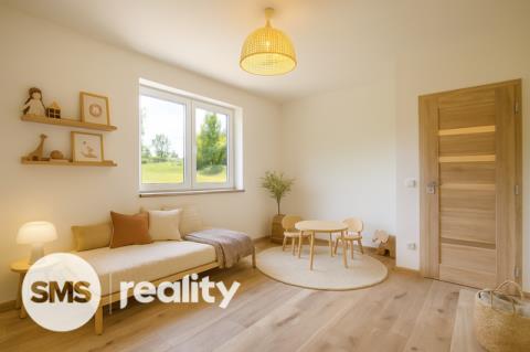 Jednopodlažní dřevostavba zaujme promyšlenou dispozicí a příjemnou atmosférou. Po vstupu vás přivítá prostorná veranda s místem pro vestavěnou skříň i botník. Na pravé straně se nachází světlý obývací pokoj propojený s kuchyní, tvořící srdce domu, odkud vede velkoformátový HS portál na slunnou terasu se zahradou. Na levé straně najdete čtyři samostatné pokoje, technickou místnost a elegantní koupelnu vybavenou vanou, sprchovým koutem i toaletou. Toaleta pro hosty je umístěna naproti verandě, což zaručuje soukromí ložnicové části.