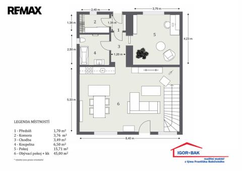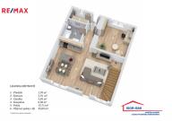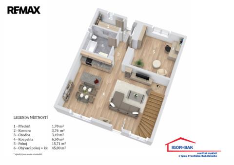První nadzemní podlaží tvoří prostorný obývací pokoj s přípravou na kuchyň (45 m²), ložnice (15,71 m²), sociální zařízení (6,50 m²), dvě chodby (3,49 m² a 1,70 m²) a komora (3,76 m²). Je zde připravena instalace pro sprchový kout, WC a pračku.