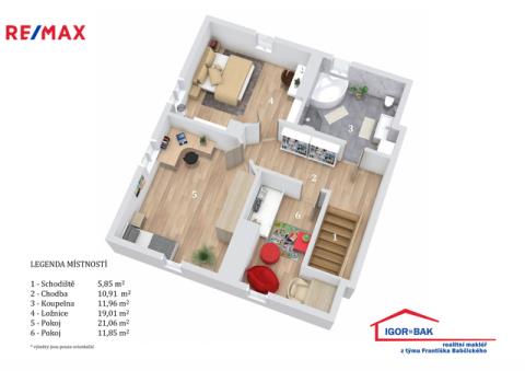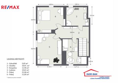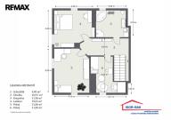 Ve druhém nadzemním podlaží se nacházejí tři pokoje (21,06 m², 19,01 m² a 11,85 m²), sociální zařízení (11,96 m²), chodba (10,91 m²) a schodiště (5,85 m²). Připraveny jsou rozvody pro vanu a WC.