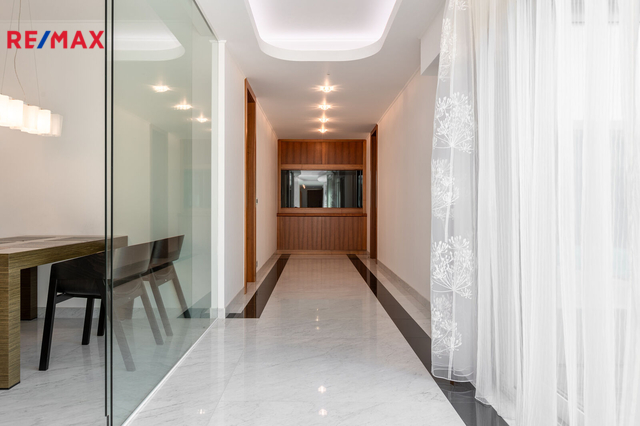 Interiér byl kompletně vyroben na zakázku a je vybaven moderními technologiemi – chytrá domácnost Crestron, centrální lux HUSKY, kamerový systém uvnitř atria včetně laserových závor kolem domu. Elektrické zámky + v každé místnosti, mimo garáže a šatny, jsou nainstalované TV. Bezpečnostní rolety, bezpečnostní ocelové vstupní dveře okna s trojsky a rámy Schüco.