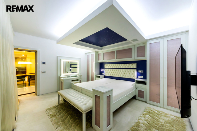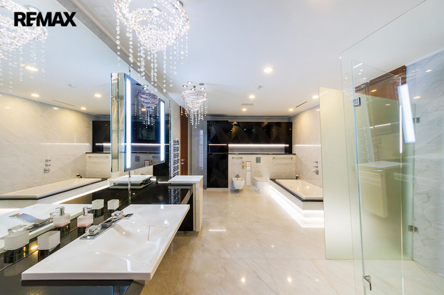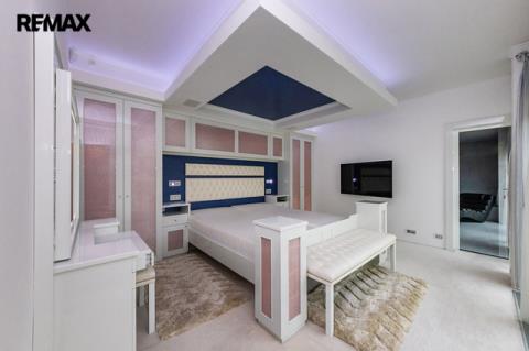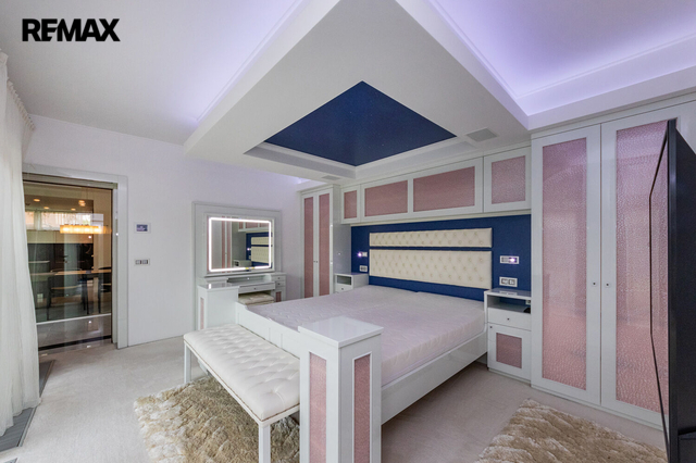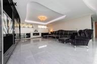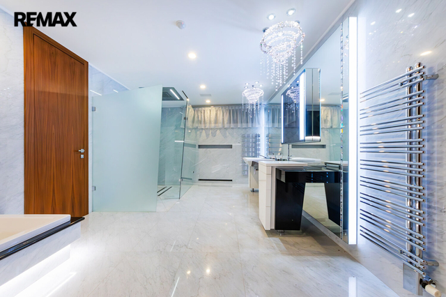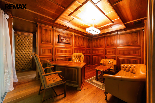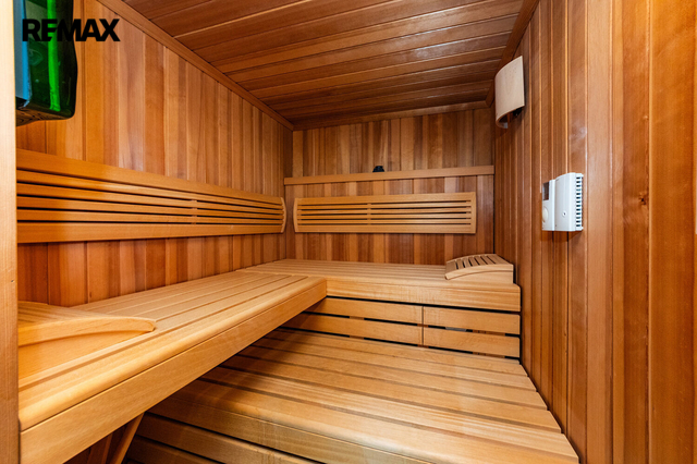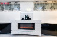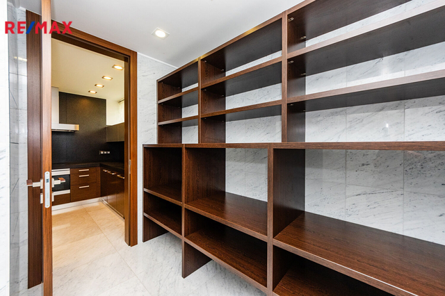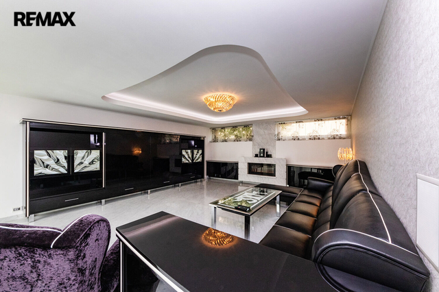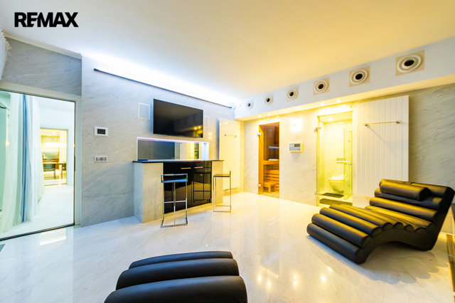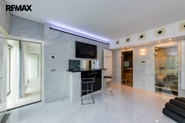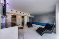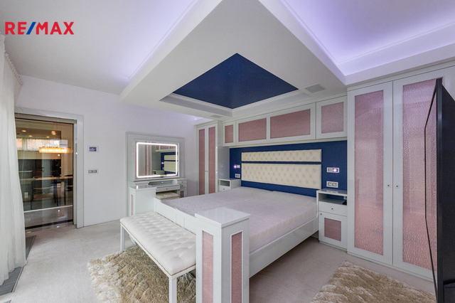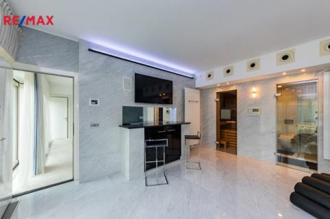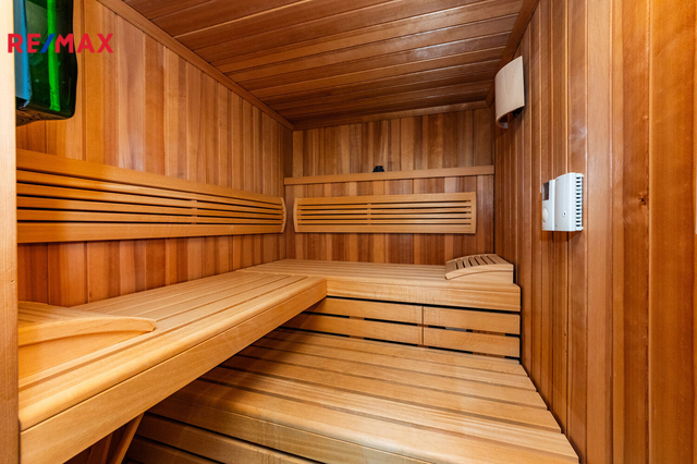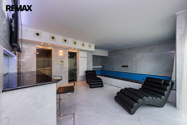 Kuchyňská linka, vybavena spotřebiči zn. Miele včetně elektricky výsuvných šuplíků, navazuje na obytný prostor, ve kterém je obývací stěna na dálkové ovládání, mramorový elektrický krb, který hřeje i praská. Dominantou ložnice je hvězdné nebe z optických vláken + koupelna Swarovski. Ve wellness části je bazén s tryskami a masážním vodopádem, sauna s dvojsystémem (pára a suchá), muzikoterapie, bar s lednicí (možnost nasvícení čtyřmi barvami).