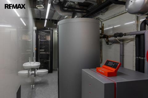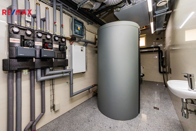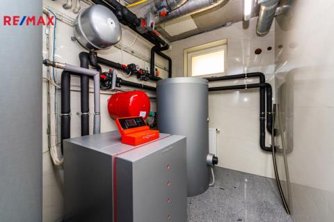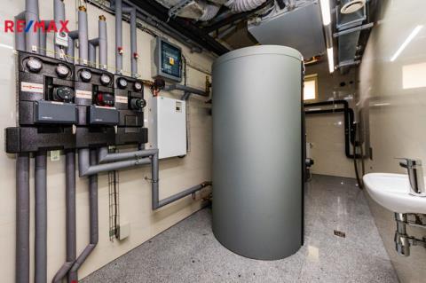 Čerstvý vzduch zajišťuje rozvedená rekuperace s chladící jednotkou, topení kotlem Viessmann zajišťují 3 stometrové vrty tepelného čerpadla pro dům i pro bazén.