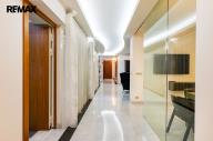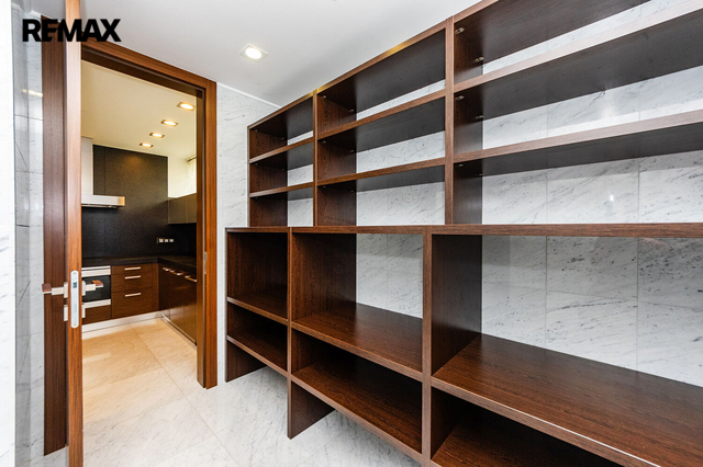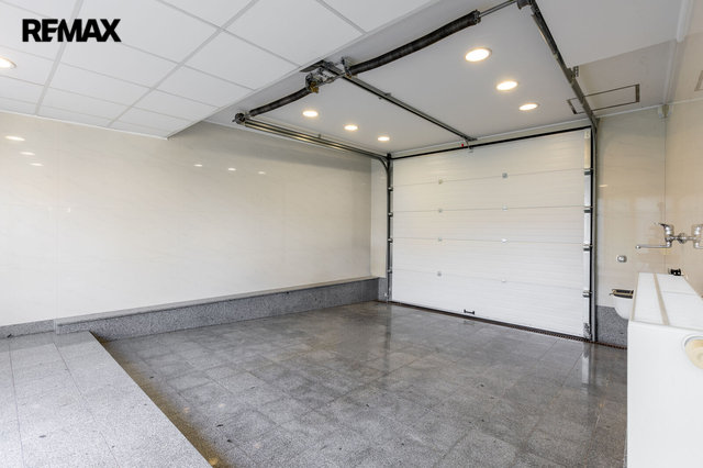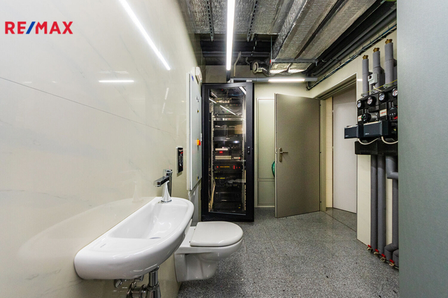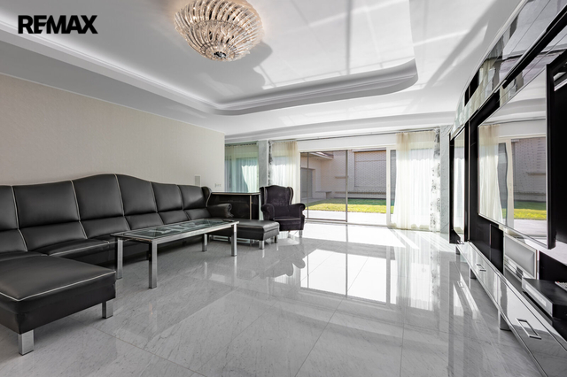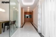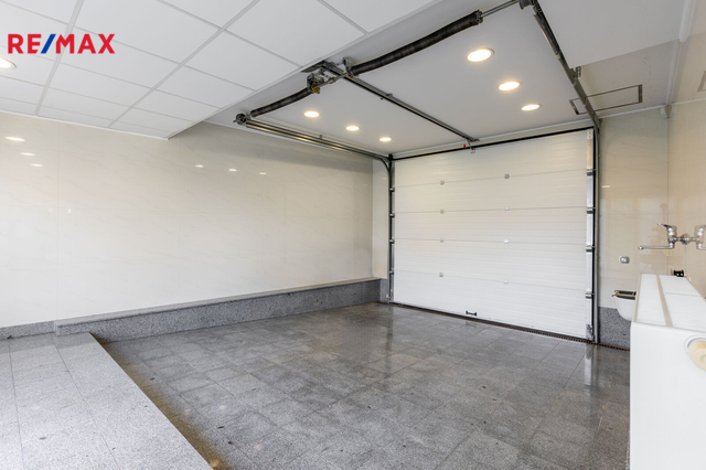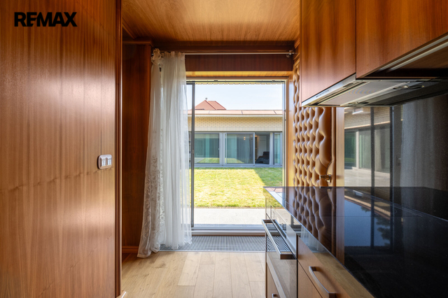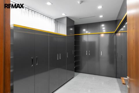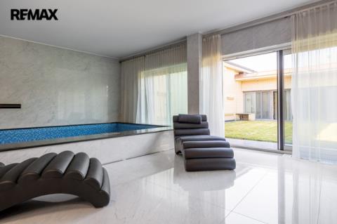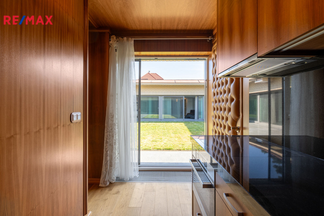 Interiér byl kompletně vyroben na zakázku a je vybaven moderními technologiemi – chytrá domácnost Crestron, centrální lux HUSKY, kamerový systém uvnitř atria včetně laserových závor kolem domu. Elektrické zámky + v každé místnosti, mimo garáže a šatny, jsou nainstalované TV. Bezpečnostní rolety, bezpečnostní ocelové vstupní dveře okna s trojsky a rámy Schüco.