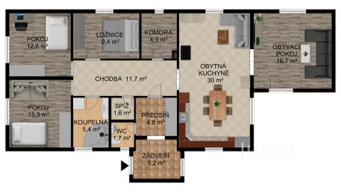 Ve všech obytných místnostech je dostatek úložného prostoru, další úložné kapacity nabízí šatna, chodba a komora.