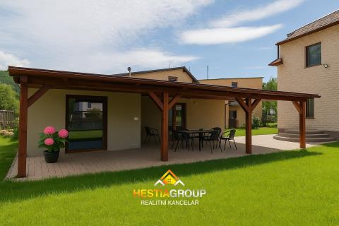 Na udržované zahradě najdete novou pergolu se zahradním zděným domem, který slouží jako celoročně využitelná společenská místnost.