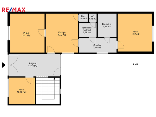 V přízemí o celkové výměře 96 m2 se nachází také další pokoj mimo byt č. 1 a společná vstupní chodba.