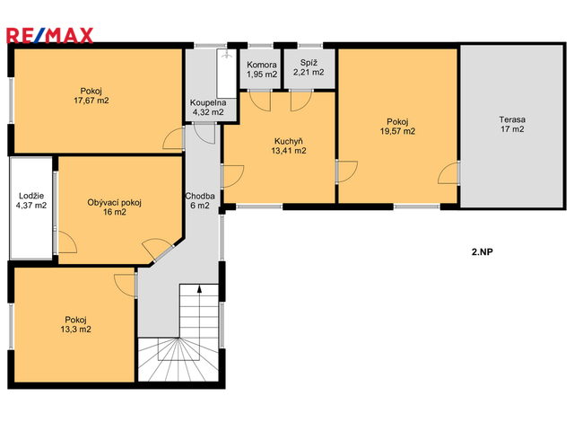 Tato bytová jednotka se nachází v 1. patře domu. Má dispozici 4 + 1 a podlahovou plochu 115 m2. Najdete v ní obývací pokoj, kuchyň, 3 ložnice, koupelnu s WC, chodbu, komoru, spíž, terasu a lodžii.