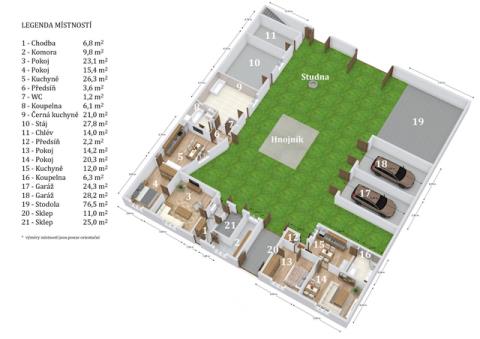 Výměnek: předsíň - 2,3 m², pokoj - 14,4 m², pokoj - 19,2 m², kuchyně - 12,9 m², koupelna - 6,1 m². Hospodářská část: černá kuchyně - 20,8 m², stáj - 28,1 m², chlév - 13,7 m², stodola - 73,5 m², garáž - 24,4 m², garáž - 27,5 m², sklep - 14 m², sklep - 28 m².